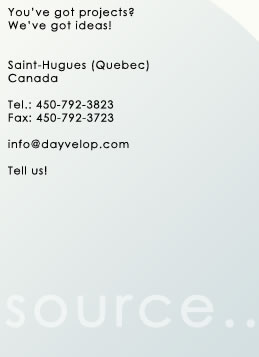 Copyright © dayvelop 2004, all rights reserved. You’ve got projects? We’ve got ideas! Saint-Hugues (Quebec) Canada Tel.: 450-792-3823 Fax: 450-792-3723 info@dayvelop.com Tell us!