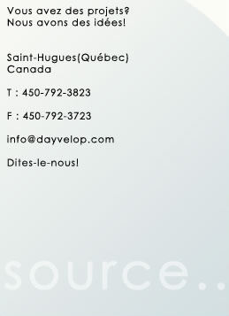 Copyright © dayvelop 2004, tous droits réservés. Vous avez des projets? Nous avons des idées! Saint-Hugues(Québec) Canada T : 450-792-3823 F : 450-792-3723 info@dayvelop.com Dites-le-nous!